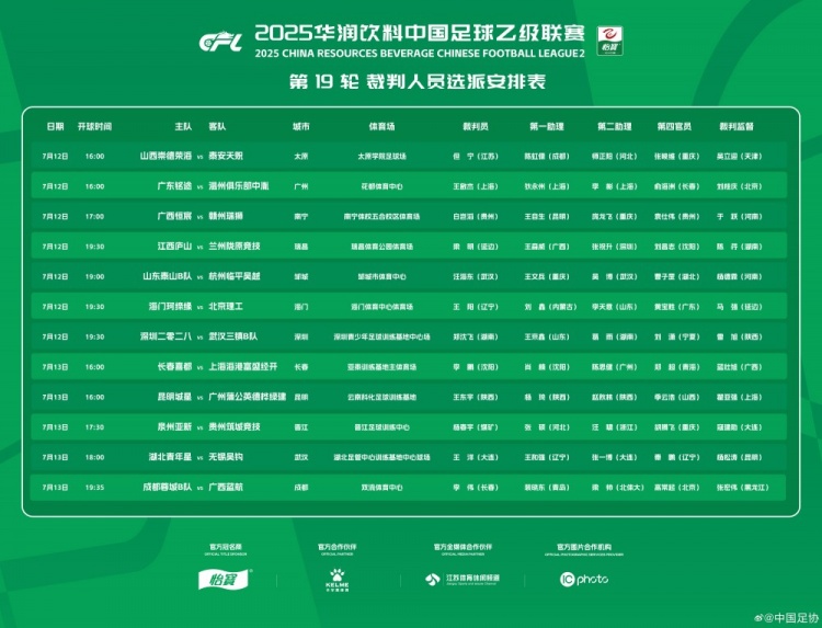7月12日讯 中国足协公布了中甲第16轮、中乙第19轮裁判安排。